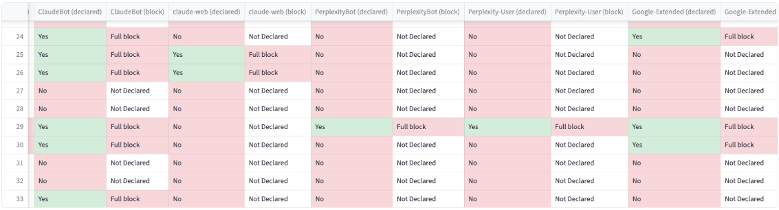- 21 sites do not block any AI crawlers.